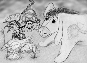 Eeyore managed to his feet and blinked, taking inventory of his person. "I was mindin' my own business, as donkeys do, when I came across this angry little bug. 'Cept I don't think he's really a bug . . . seein' as how he talks back. Can't say I know everything, "But he doesn't look like a tiny person either. . . though I could be mistaken."