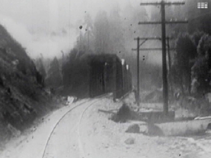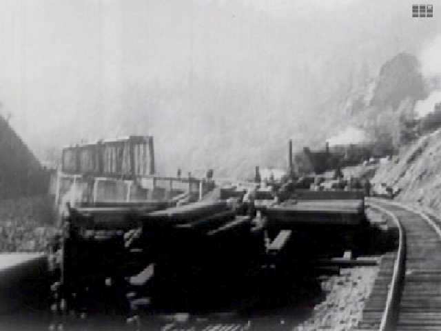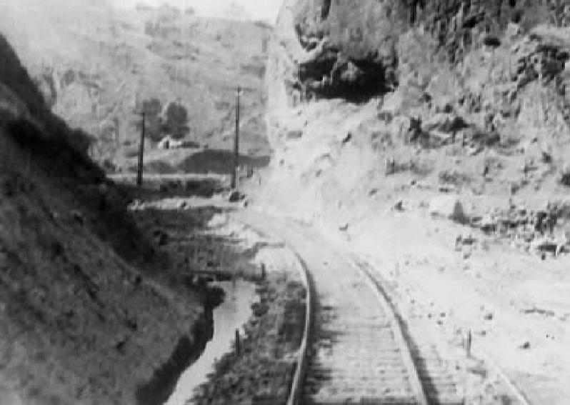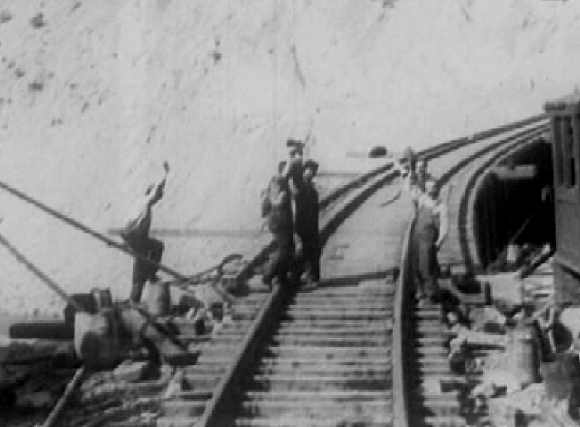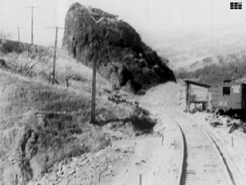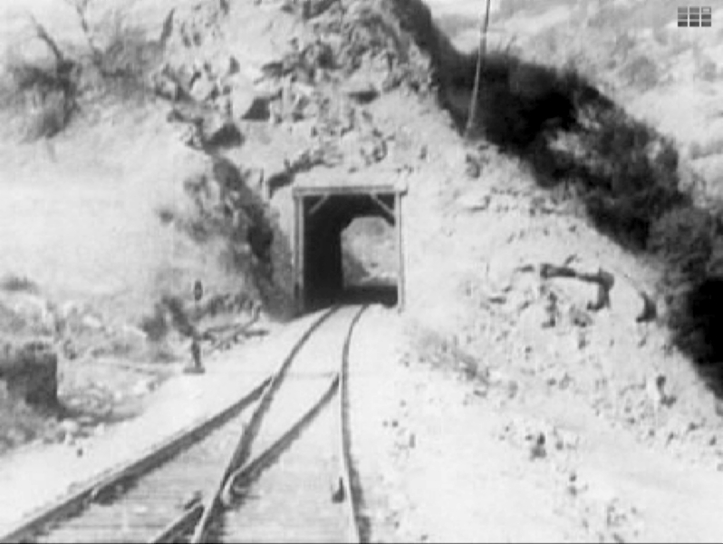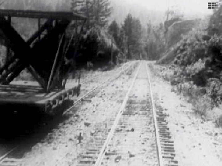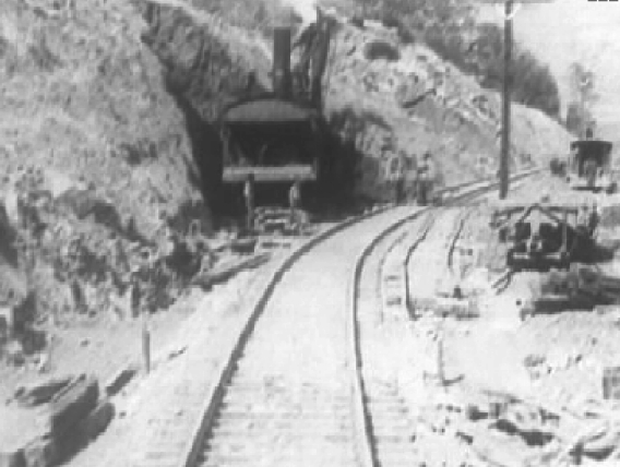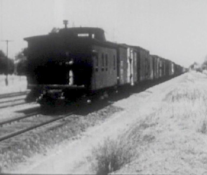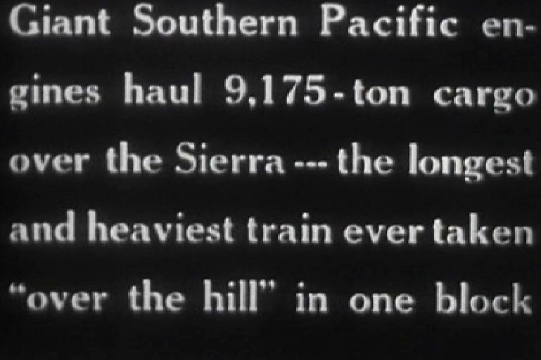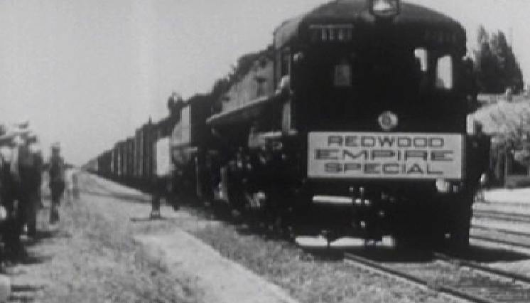 Below is a series of "screenshots" from three silent movies on the NWP... two are apparently from when the line opened, along the route, the "golden spike" ceremony, and a huge parade in downtown Eureka. The third film is about a "Redwood Empire Special," identified as a 121-car train of North Coast Redwood destined for the east from Sacramento over Donner. Power is SP Cab-Forward 4144; California Governor James "Sonny Jim" Rolf hams it up quite a bit as the supposed engineer of the train, which is described in the film as the heaviest ever taken over Donner in a single section- no date, but probably about 1930.