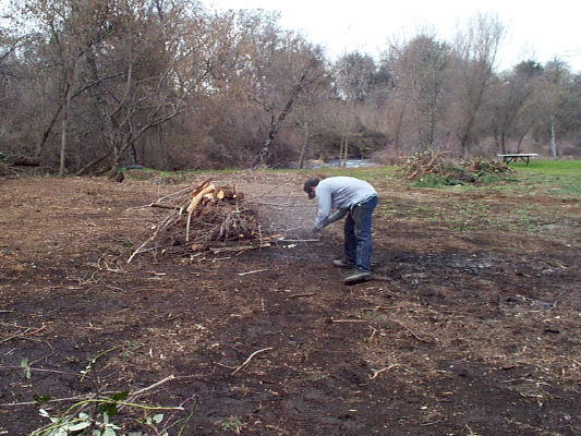 John about to throw a match on the gas trail leading to the wood pile