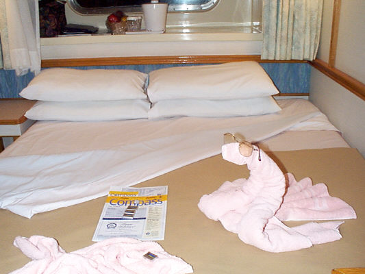 Our cabin attendant, Jesus, was quite the character. When we came back to our room, we had a good laugh at his art work. Jesus had shaped the towels into a snake (with my glasses) and a fish with the mint being the eye of the fish.