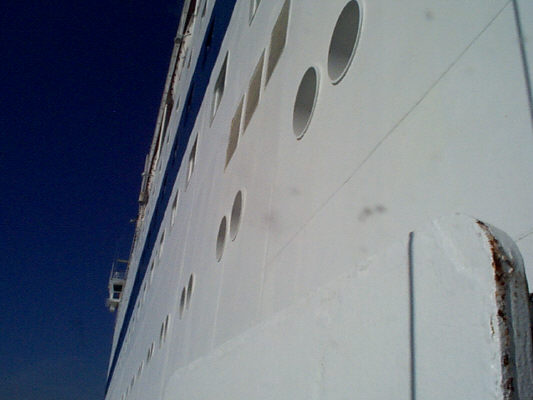 After I got on the small boat, I looked up and took a shot of the side of the ship. The ship is actually much taller than this, as there are more decks above the highest visable rail in this picture.