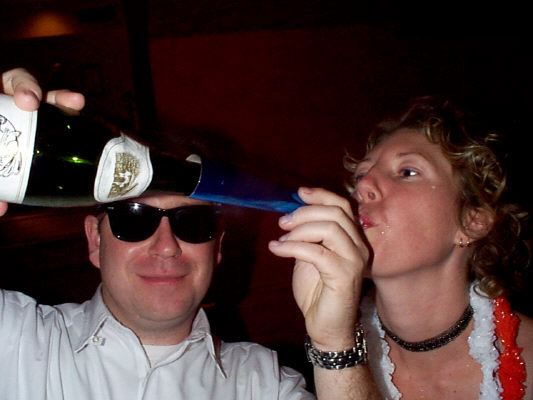 Jim pours champagne into Stacey horn ... erm... blower.