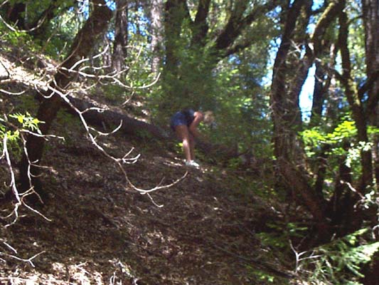 Sandy climbs up the bank to pull up some maidenhair fern.
