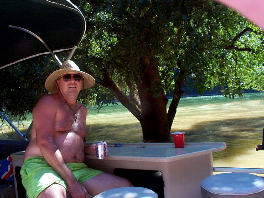 We found a flat sandy spot under a huge tree to moor the boat. Dennis has a beer at the bar while we get the BBQ going.