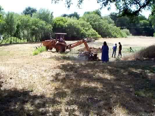 Backhoe is digging a huge hole to roast the pig. A load of River rock is placed in the hole, then a bunch of oak. The oak heats up the rocks and when the oak burns down, the pig (wrapped in sacking) is placed in the hole and dirt is then piled on top. It takes a night and a day to cook.