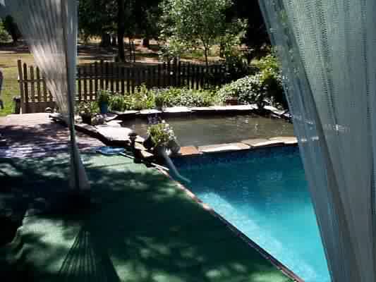 Pond at the side of the pool. Rocks still need to be cemented so the water runs OVER them. And a rountain in the middle and plants etc still need to be added... but it was a rush job for the wedding.